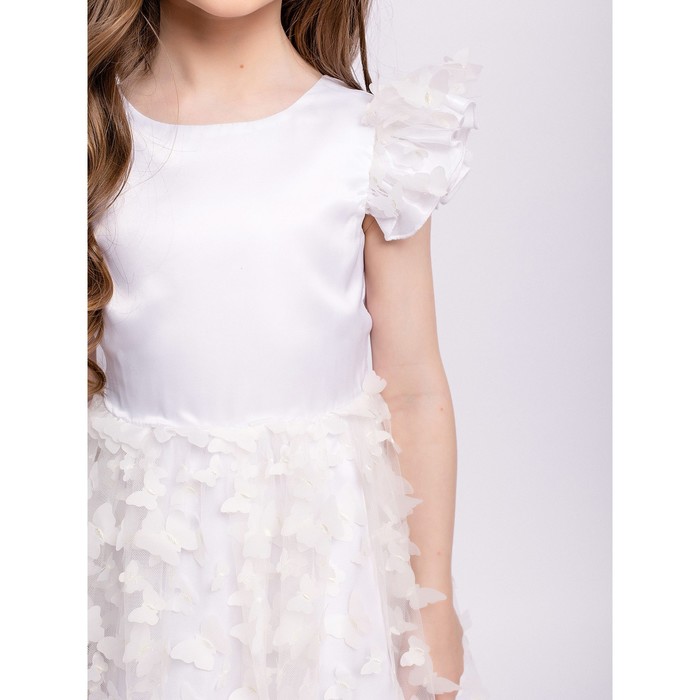 Нарядное платье «Рэйчел» выполнено с пышной юбкой и шлейфом. На спинке имеется поясок, чтобы дополнительно утянуть талию. Подкладка 100% хлопок. Платье украшено объёмным узором в виде бабочек. Короткие рукава с оборками. Платье подойдёт для празднования выпускного, дня Рождения, Нового года.