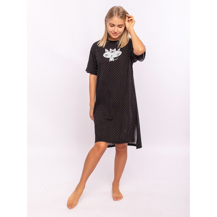 Платье для девочки с коротким рукавом выполнено из супрема. Стильное трикотажное платье длины ниже колена с разрезами по бокам. Спущенный рукав, круглый вырез горловины. Чёрная расцветка и принт в мелкий горошек. Комфортное в носке платье из гипоаллергенного материала станет прекрасным дополнением базового гардероба детей и подростков.