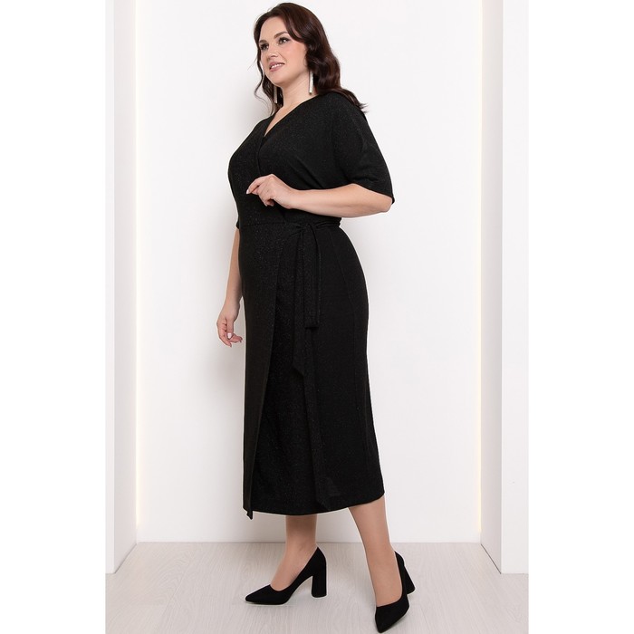 - Платье женское полуприлегающего силуэта из трикотажного полотна с люрексом, отрезное по линии талии, с запахом и завязывающимися полупоясами