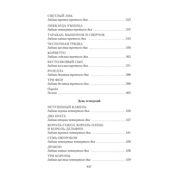 Фривольные и даже жестокие сюжеты, вмешательство фей и орков, герои, которые не лезут за словом в карман, горячность юности и уныние старости, назидания и приключения - все это вместилось в пятидневный сказочный марафон, в пятьдесят занимательных и поучительных историй (отсюда и ещё одно название книги - «Пентамерон», «пятидневник»).