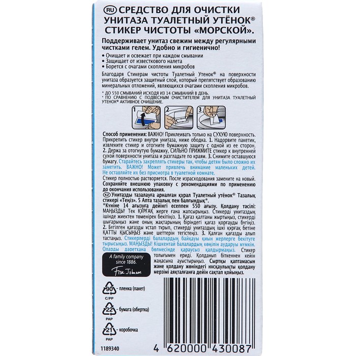 Благодаря очистителю на поверхности унитаза образуется защитный слой, который препятствует образованию минеральных отложений, являющихся очагами скопления микробов. Очиститель крепится внутри унитаза ниже ободка на сухую поверхность. Обладает приятным ароматом. Стикера хватает более, чем на 100 смываний. Он полностью растворяется в воде.