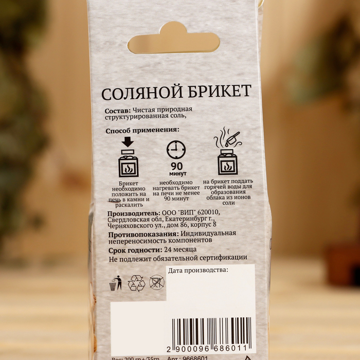 application: Heat the briquet on the stove for at least 90 minutes, then give in hot water to it. Salt will fill the air with baths with ions, thereby will help relieve fatigue, improve blood circulation and overall well -being.