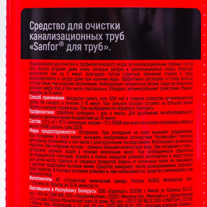 cleaning of the pipes in the kitchen will not take much time with a means from Sanfore, its use is very simple. Gently pour 250 ml of gel into the pipe hole or directly into the water. Then leave it for 5-15 minutes to influence, then thoroughly rinse with a strong stream of water to clean the pipes. Due to its special formula, household chemicals from Sanfor will quickly and effectively eliminate blockages, without leaving unpleasant odors.