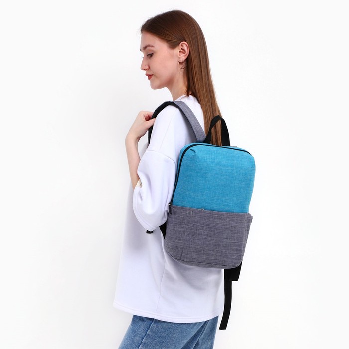 School backpack, lightning department, external pocket, blue/gray color