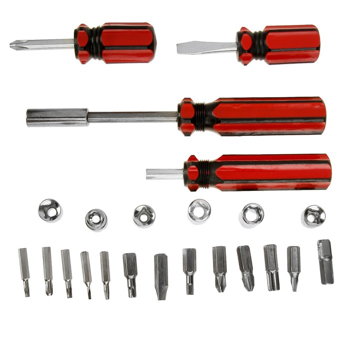 Screwdrivers with a set of bits and scrap heads, plastic handles, 23 objects