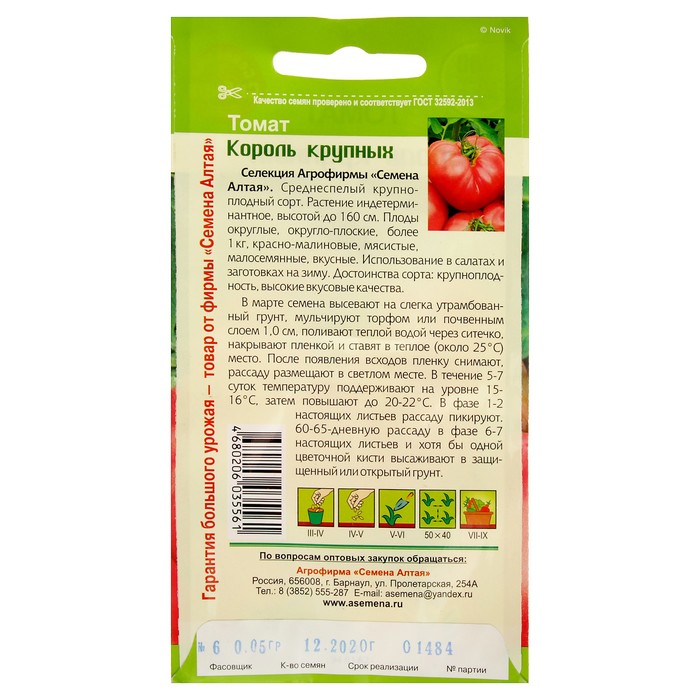 selection of the altai seeds "Seeds". The mid -grooved large -fruited variety. The plant is indeterminant, up to 160 cm high. The fruits are rounded, rounded, more than 1 kg, red-rack, fleshy, low-seed, delicious. Use in salads and blanks for the winter. Advantages of the variety: large -fruited, high taste quality.