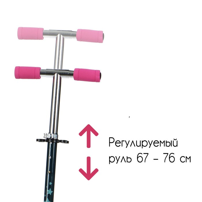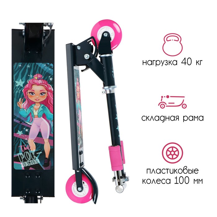 the platform with a rough coating prevents the sliding of the legs. The height of the steering wheel is regulated and fixed in three positions. The frame is folded: the steering rack drops to the deck. In this position, the scooter takes up little space.