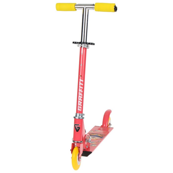 The frame folds: the steering stand falls to the deck. In this state, the scooter takes up little space. A rough coating platform prevents legs sliding. The height of the steering wheel is regulated and fixed in three positions.