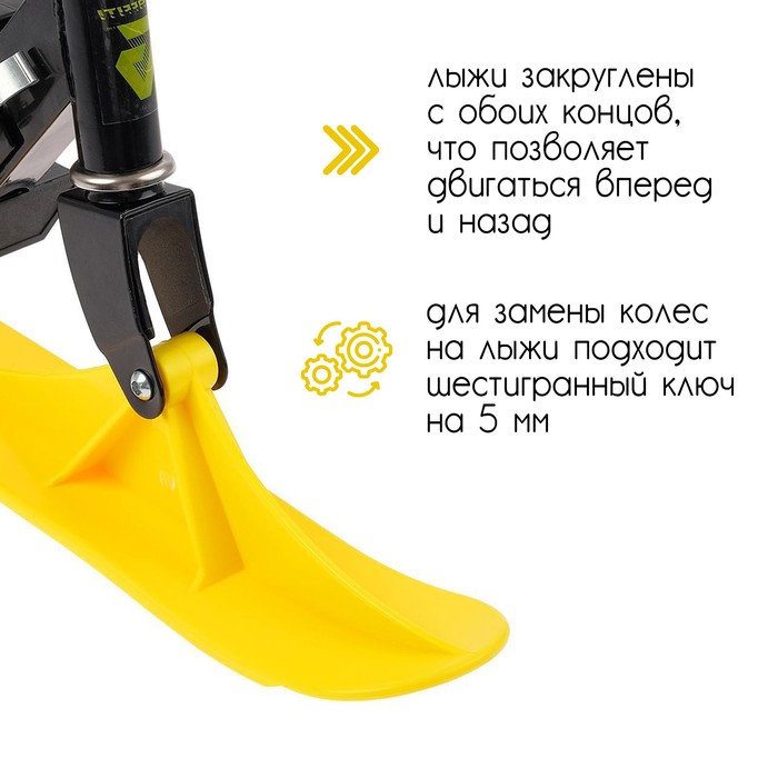 Children's Self-Cat Association is a new model for summer and winter outdoor activities. The design is a scooter frame on which skis are installed. The front ski is controlled by the rotation of the steering wheel. The wheels can be installed at any time, for this there is everything you need.