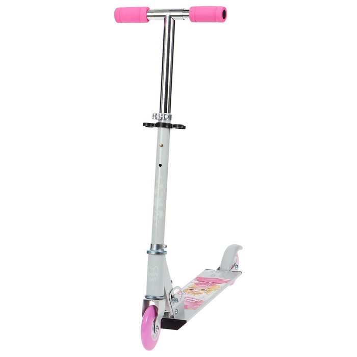 the platform with a rough coating prevents the sliding of the legs. The height of the steering wheel is regulated and fixed in three positions. The frame is folded: the steering rack drops to the deck. In this position, the scooter takes up little space.