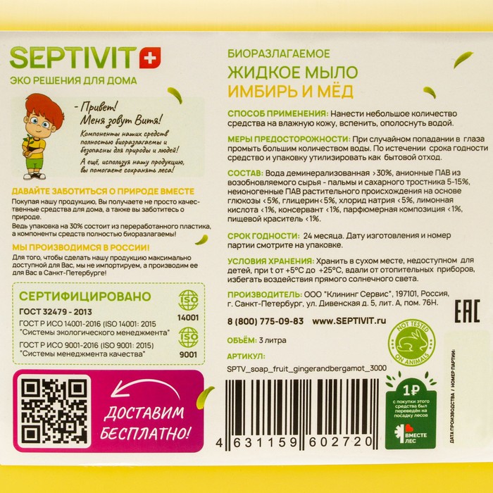 Natural hypoallergenic components of the Septivit Premium soap protect and moisturize the skin of the baby! Liquid soap has a neutral pH, has a pleasant fresh aroma, carefully cleanses, does not cause irritation and is completely washed off with water. Soft consistency and thick foam provide the most economical consumption of the product, and with this volume this will allow you to forget about the purchase of new soap for a long time!