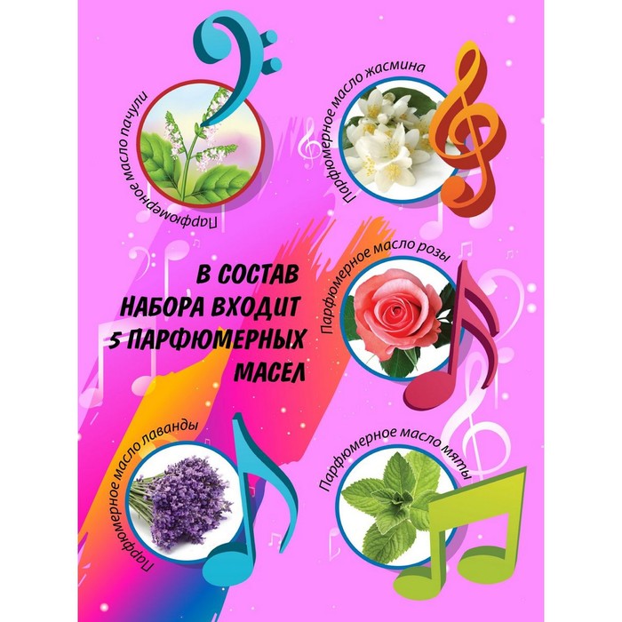 The set has everything that can come in handy while working on its own perfume masterpieces. There are perfumes roses, orange, pine, lavender and patchouli in the kit, from which you can make an impressive bouquet of aromas.