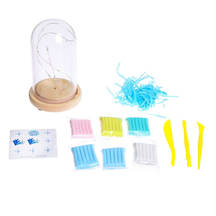 To create an original nightlight, it is necessary to blind a polymer clay figure. A detailed instruction that is included in the set will help you with this. In conclusion, pour the decor into a jar. Add the figure and turn on - the nightlight will shine with bright lights!