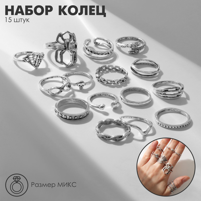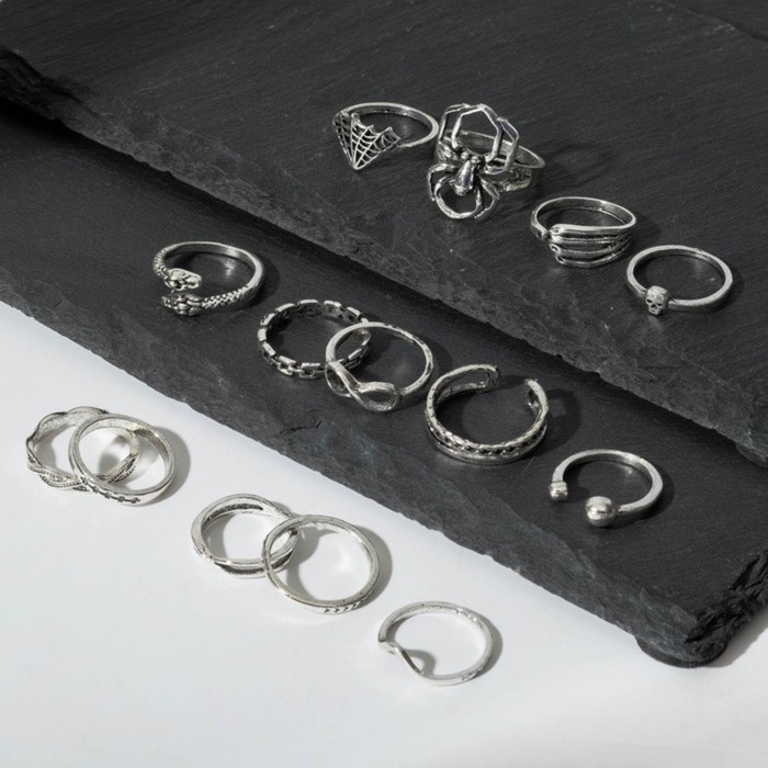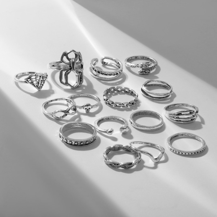 Set of rings 15 pieces "Assorted" Spider, Web, Size Mix, Color Black Silver