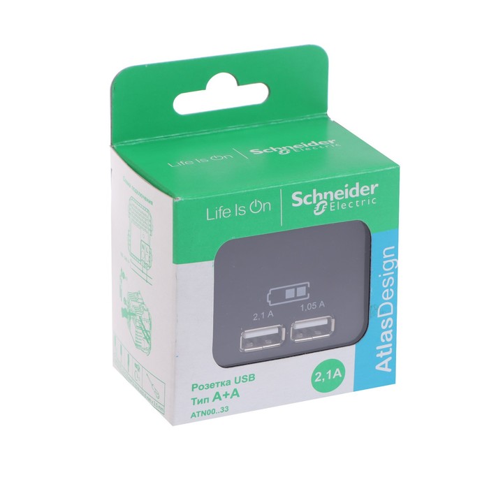 Schneider Electric AtlasDesign socket mechanism with two USB output voltage and outputs with a rated current of 2.1 A. USB allows you to directly charge one Or two mobile devices. Plastic with silver ions in white provides an antibacterial effect. Facial parts from high-quality ABS plastic, resistant to scratches and UV radiation. Reinforced straight mounting paws for better fixation of the mechanism in the mounting box.