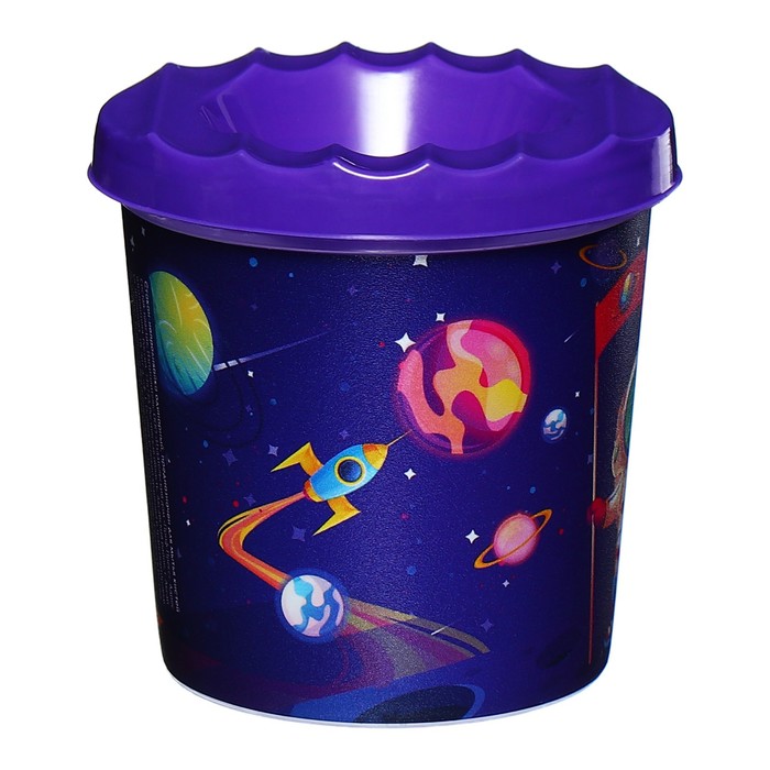 a special shape of the glass cover excludes the possibility of water flow. The line on the transparent case indicates the maximum possible level of filling. Made of durable plastic. There are special recesses on the lid for placing brushes. Full volume - 210 ml. Volume to a level - 75 ml. The original design will make the drawing process even more exciting
