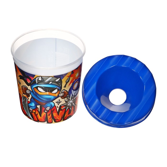 a special shape of the glass cover excludes the possibility of water flow. The line on the transparent case indicates the maximum possible level of filling. Made of durable plastic. There are special recesses on the lid for placing brushes. Full volume - 210 ml. Volume to a level - 75 ml. The original design will make the drawing process even more exciting