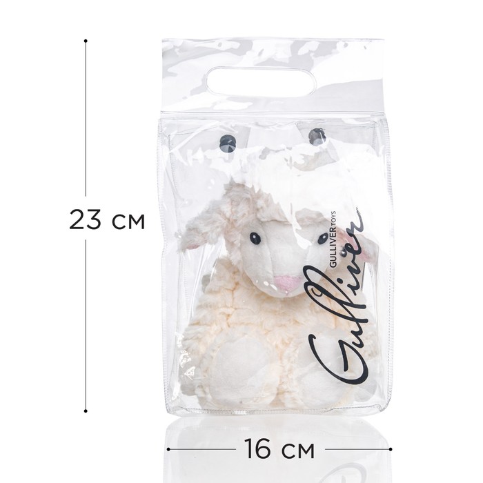 A soft toy is packed in a dense transparent branded handbag on the buttons, which simultaneously serves gift packaging.
