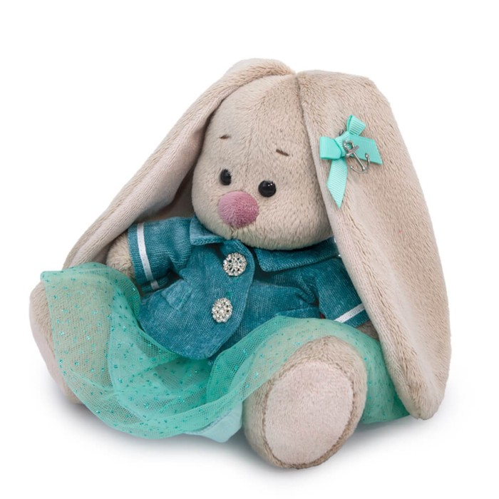 Soft toy "Bunny Mi" - a charming fashionista in the color of the color of turquoise water. Such a gift will delight the girl and give joyful emotions. A stylish animal will develop the fantasy of the baby and will become excellent partners in games.