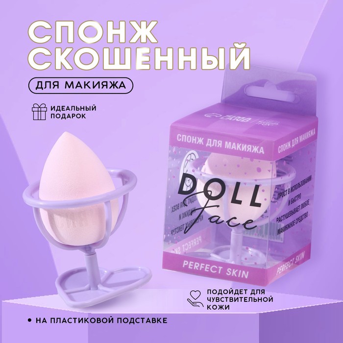 Sponge mowed Doll Face on a plastic stand for drying and storage