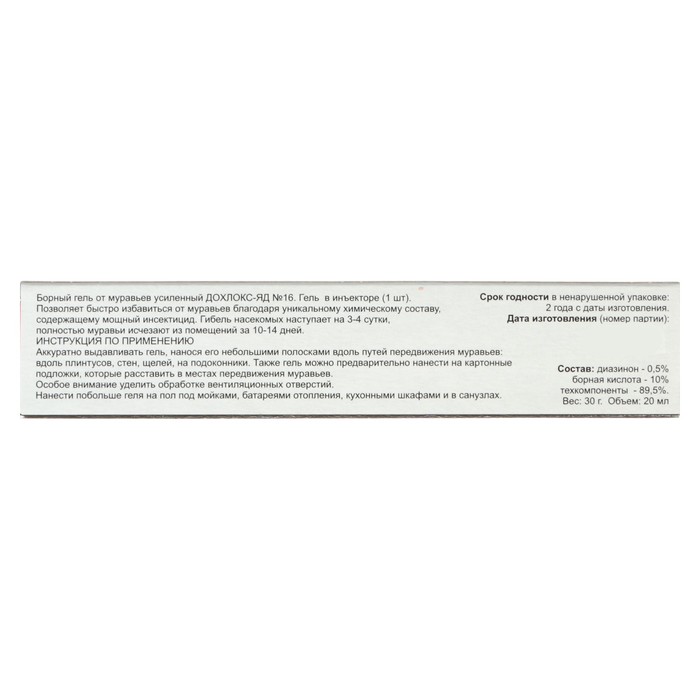 The product allows you to quickly and effectively get rid of cockroaches. The bait includes superpower insecticide. Instructions for use: apply gel to the substrates or directly to the surface along the cracks, skirting boards, pipes and other habitats and the movement of insects. 1-2 weeks after processing, it is recommended to arrange traps. Recommended funds for the expenditure of the product. If the cockroaches have just appeared: 1 package of 45 m². Use only in places of appearance. If the cockroaches have long been, but there are not very many of them: 1 pack for each room. If there are many ants: 1 package per 5 m². Use in all rooms. If there are a lot of cockroaches and there is a constant source of infection (for example, neighbors): 1 package per 3 m². In this case, the gel is applied around the entire perimeter of the room with almost no gaps. Store in a dry, cool, darkened room, inaccessible to children and pets, far from food. After working with the tool, wash your hands with soap. If you get into the eyes or to the skin, wash off a lot of water.