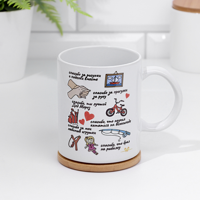 The mug is made of ceramics. The drawing is applied by sublimation, in which the paint penetrates the upper layer of the product, so the image is stable.