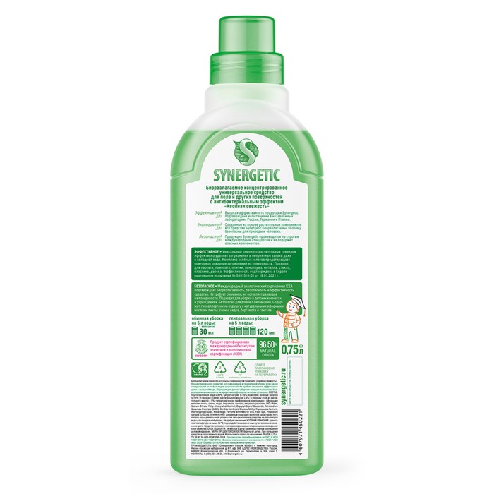 Biodegradable concentrated agent with antibacterial effect Synergetic “coniferous freshness” is a universal remedy for daily and general cleaning of the floor and other surfaces: tables, walls, ceiling. Even in cold water. A complex of green lentes prevents re -settlement of contaminants on the surface. Suitable for parquet, laminate, tiles, linoleum, metal, glass, plastic, wood.