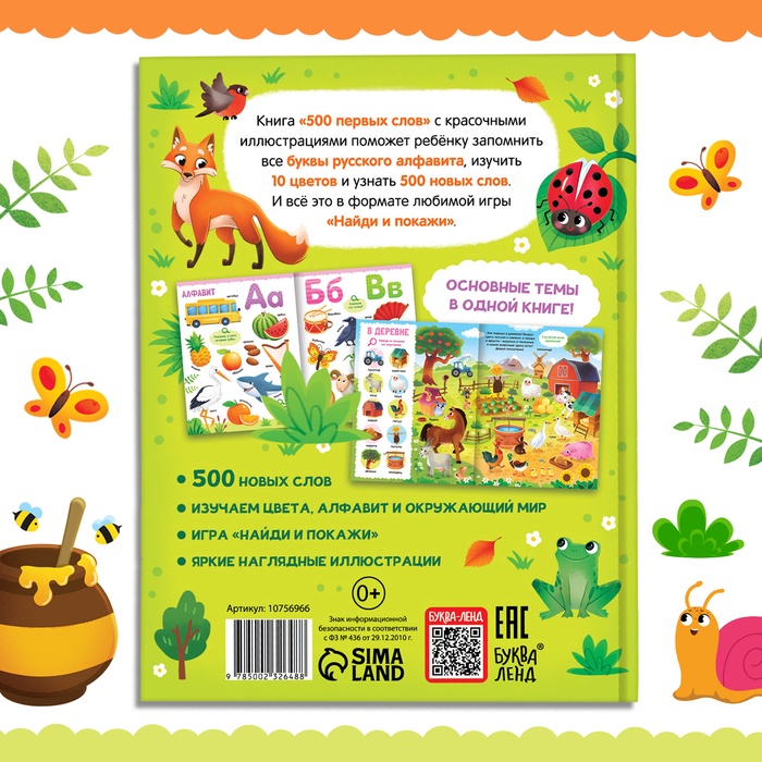 Book "500 first words. Find and show ” - an ideal satellite for babies from 2 years old, who begin to study the world around him. Thanks to an exciting format and vivid illustrations, the child easily remembers new words, develops attention and learns to find objects in various thematic scenes.