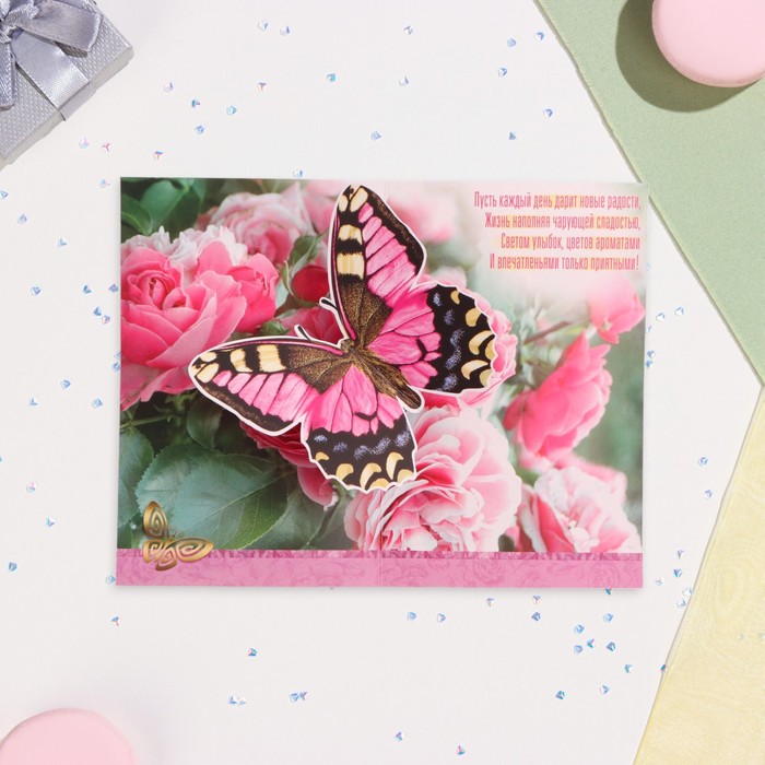 The complex is complex "Happy birthday!" Pink flowers, embossing, A5
