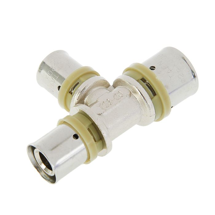 The tee is designed to connect locking reinforcement, as well as for fastening several metal -plastic pipes of various diameters into a single water supply system. The tightness of the installation is ensured by deformation of the steel sleeve, which occurs when the fitting is squeezed with press rooms.