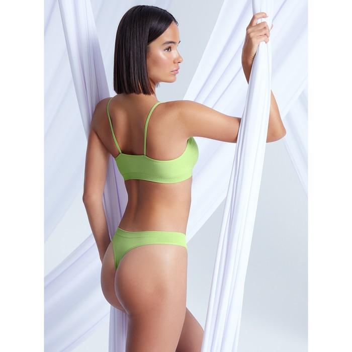 The female top minimi on thin straps is made of microfiber, which has a smooth texture, pleasantly feels on the body, perfectly passes air, absorbs moisture, preserves the shape and color.