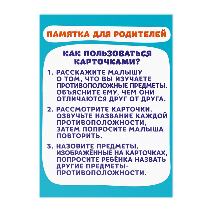 The training cards will allow the child to get acquainted with opposite concepts from early childhood, and also help to develop memory, intelligence, visual and auditory perception.