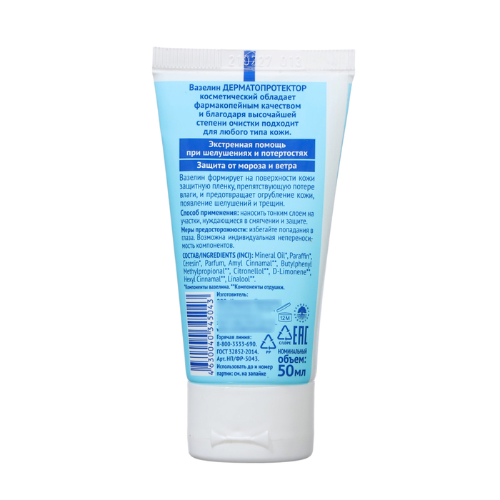 Vaseline dermatoprothemer cosmetic has a pharmacopeic quality and, due to the highest degree of cleaning, is suitable for any skin type. Vaseline forms a protective film on the surface of the skin, preventing the transepidermal loss of moisture, coarsening of the skin, the appearance of peeling and cracks. After use, the skin becomes soft and moisturized.