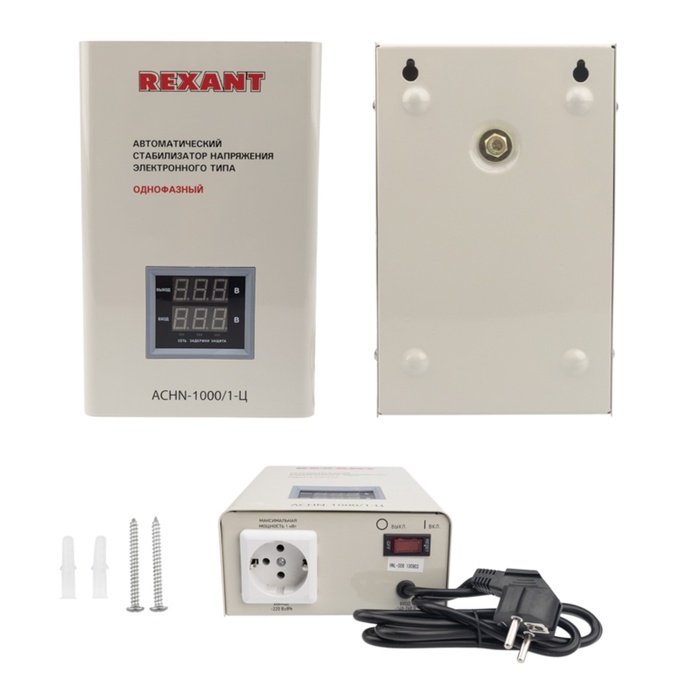 A single -phase relay voltage stabilizer Rexant is used to protect various household and industrial electrical appliances from voltage drops in the network and short circuit currents.