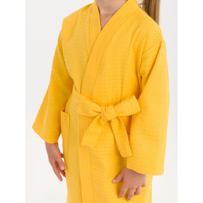 Waffel robe for children made of natural material - 100% cotton with pockets, is convenient and universal. The fabric does not cause allergies and irritation of the skin, perfectly passes the air, quickly absorbs moisture and also dries instantly. The shape of a dressing gown with a smell and a wide belt will allow you to use it for a long time, despite the rapid growth of the child. Therefore, for home care for children, a wafel dressing gown is one of the most convenient and practical things. Waffle fabric robe is light and practical, due to the natural composition of the fabric, a comfortable body temperature remains ideal for a hot summer. After any water procedures, a waffle robe will create a pleasant coolness and quickly dry the body, it is free and pleasant to children's skin.