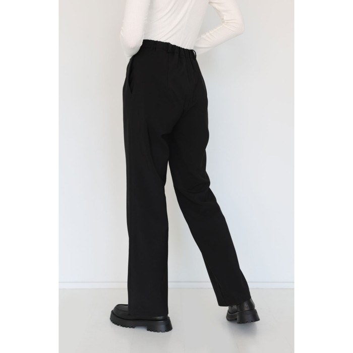 Pants straight cut from a dense costume fabric on a fleece with an elastic band on the waist from the back side. Side pockets, a button on a button and zipper.