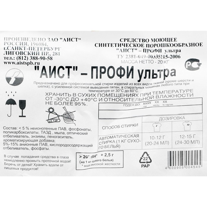 Powder washing machine for colored and white linen. Designed for professional washing of products from all types of fabrics, except for wool and silk, in washing machines of any type.