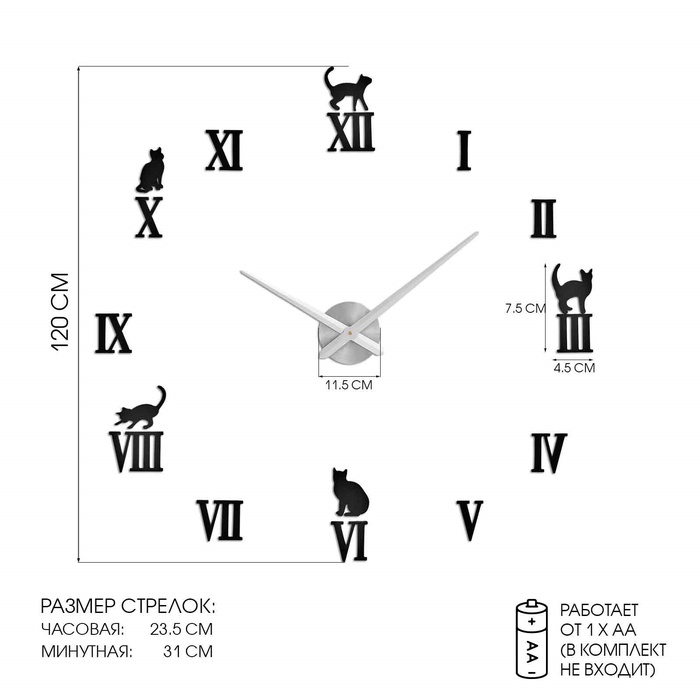 Watching interior, 3D "cats", silent, sticker, large, d-120 cm