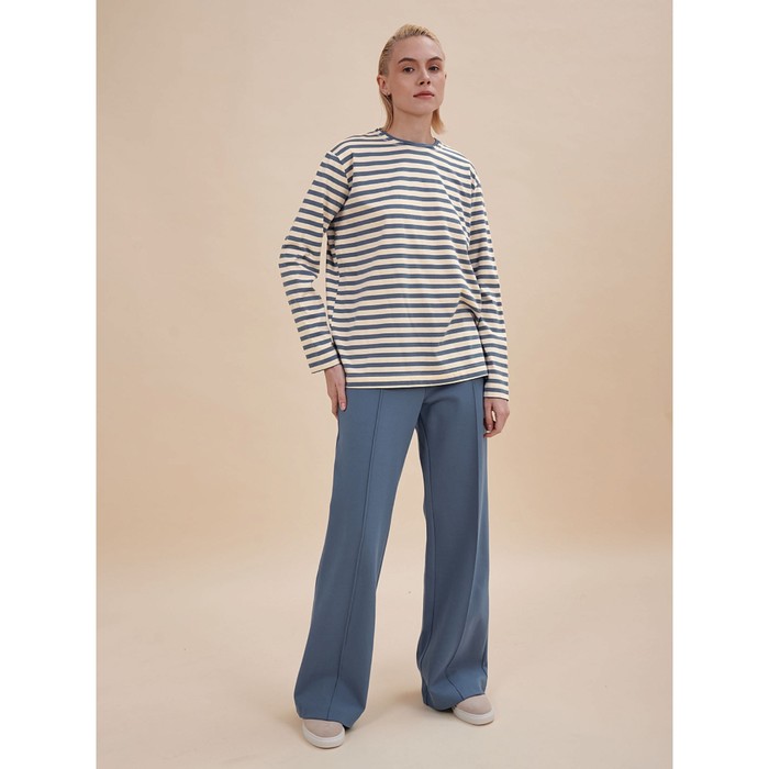 - The model of a relaxed silhouette in a strip is complemented by comfortable straight long sleeves