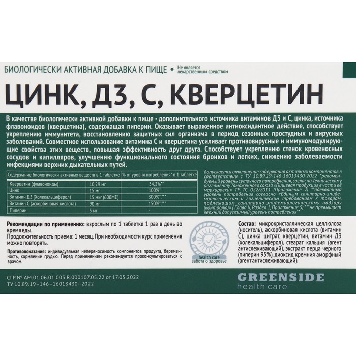 Zinc, d3, c, quercetin, 30 tablets 600 mg